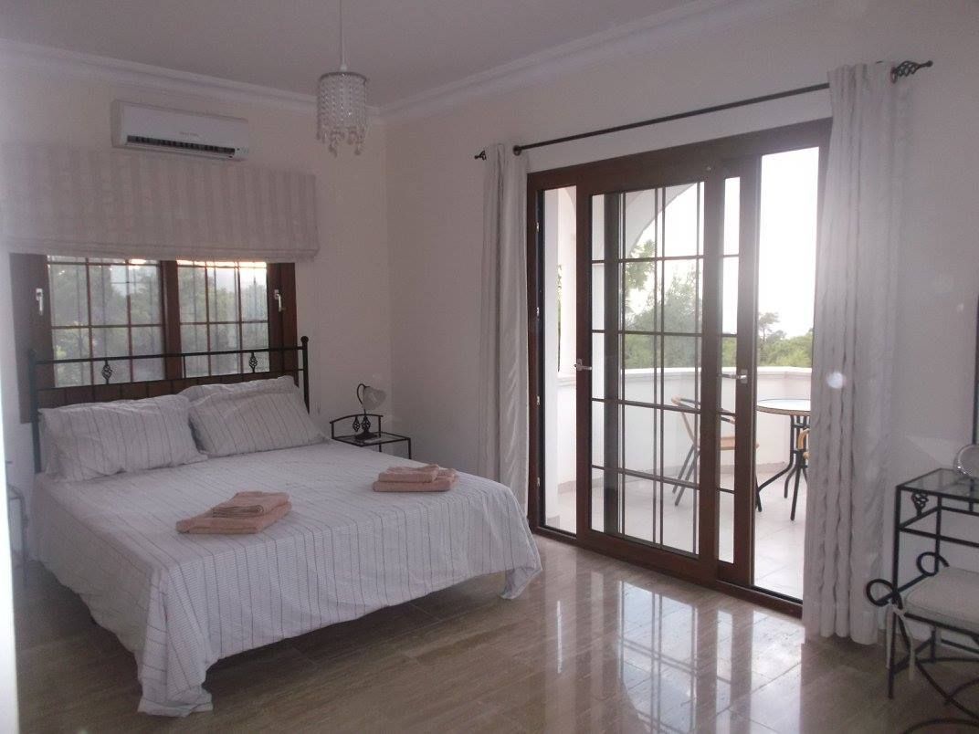 Up the spiral staircase on the 1st floor landing, left into a twin room with 2 single beds and a magnificent panoramic view of the ravine, mountains and sea. The Master bedroom with it's en-suite shower room has it's own private balcony with bistro table and 2 chairs, overlooking the pool, with ravine and sea views.